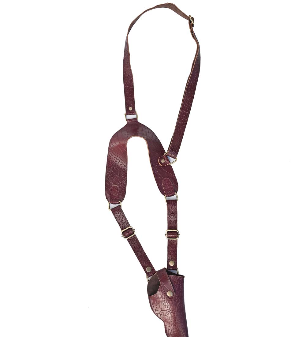 Add a bold, utilitarian edge to your ensemble with this premium leather shoulder holster, featuring a rich crimson hue and a deep crocodile-embossed texture. The adjustable harness is secured with aged brass-tone hardware and snap fasteners, ensuring a custom, ergonomic fit for all-day wear.