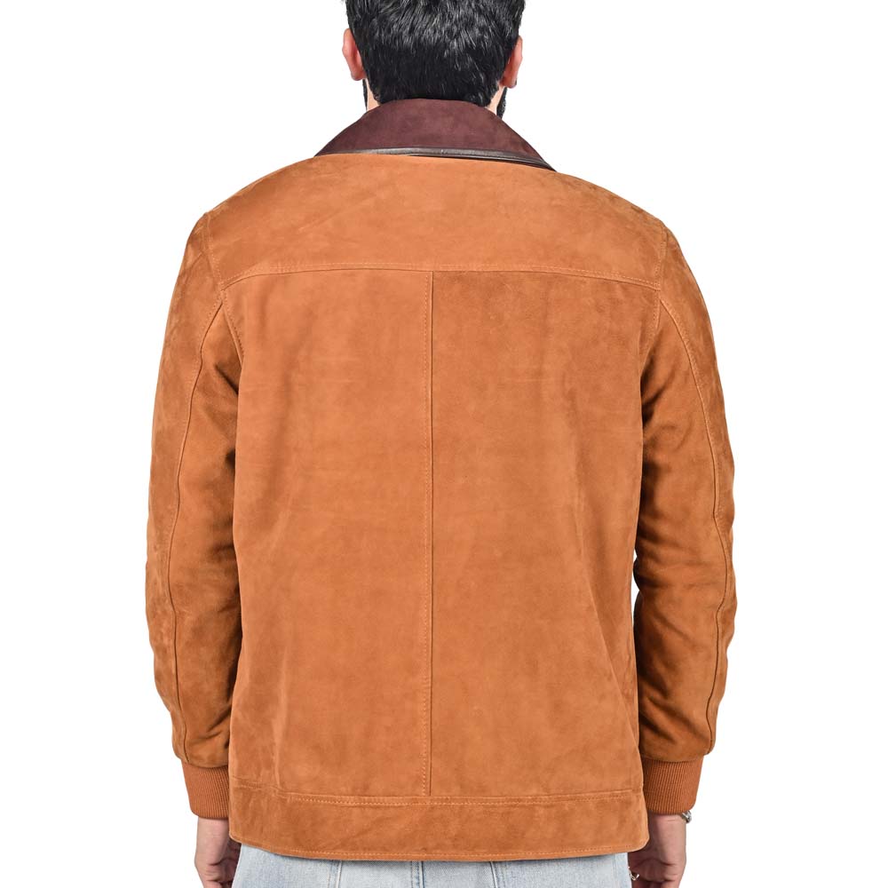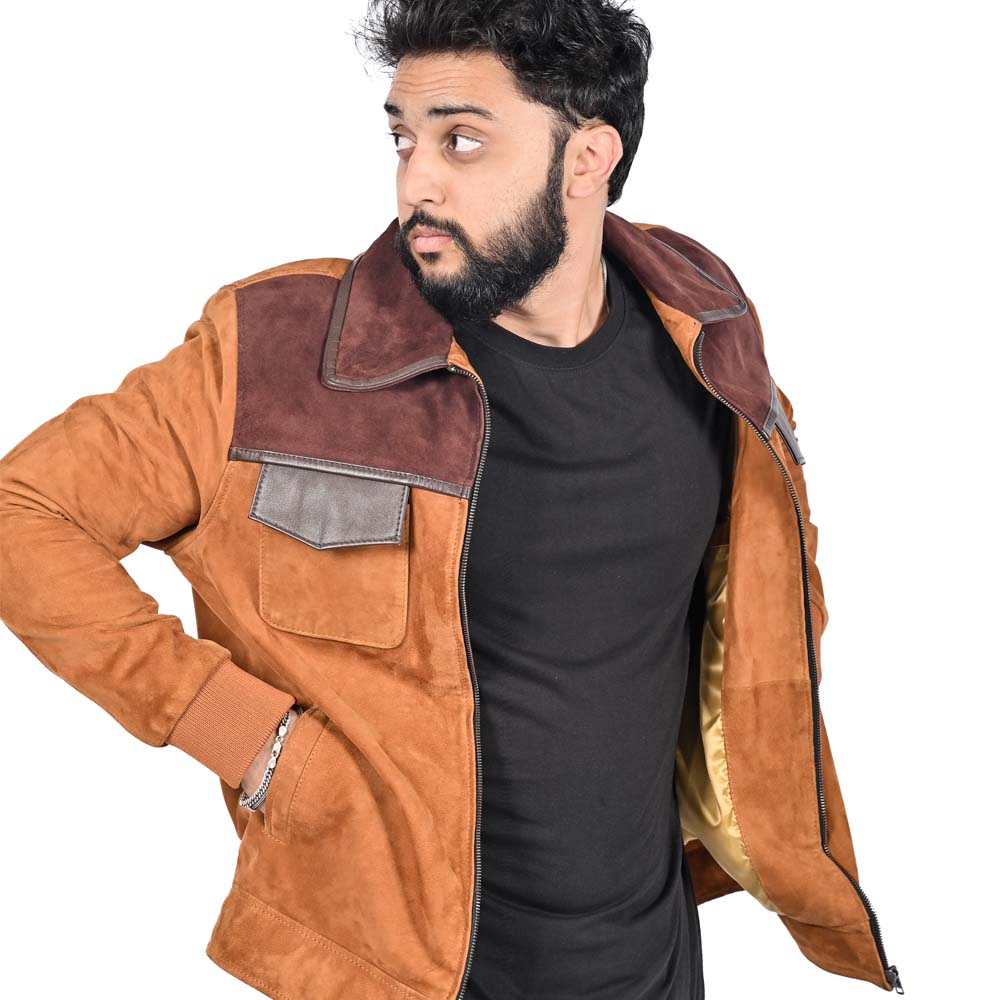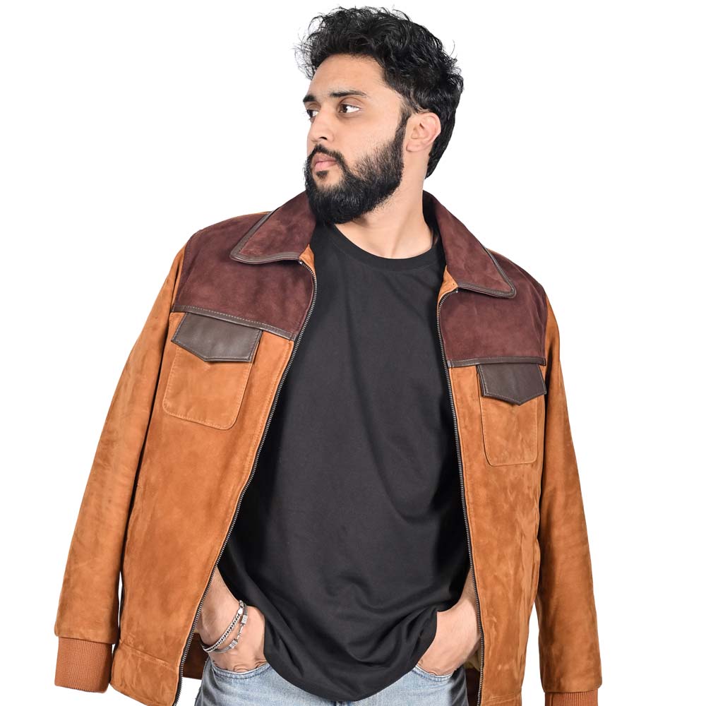 This premium field jacket features a sophisticated tri-tone palette, combining a warm tan suede body with deep mahogany shoulder yokes and chocolate leather pocket accents. The architectural design is detailed with a classic spread collar, ribbed knit cuffs for a tailored fit, and dual utility chest pockets with refined leather flaps. Merging rugged heritage with contemporary color-blocking, this piece is an essential statement for a polished, multi-dimensional autumnal wardrobe.