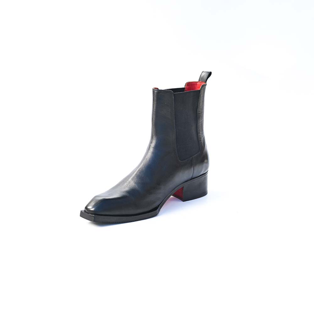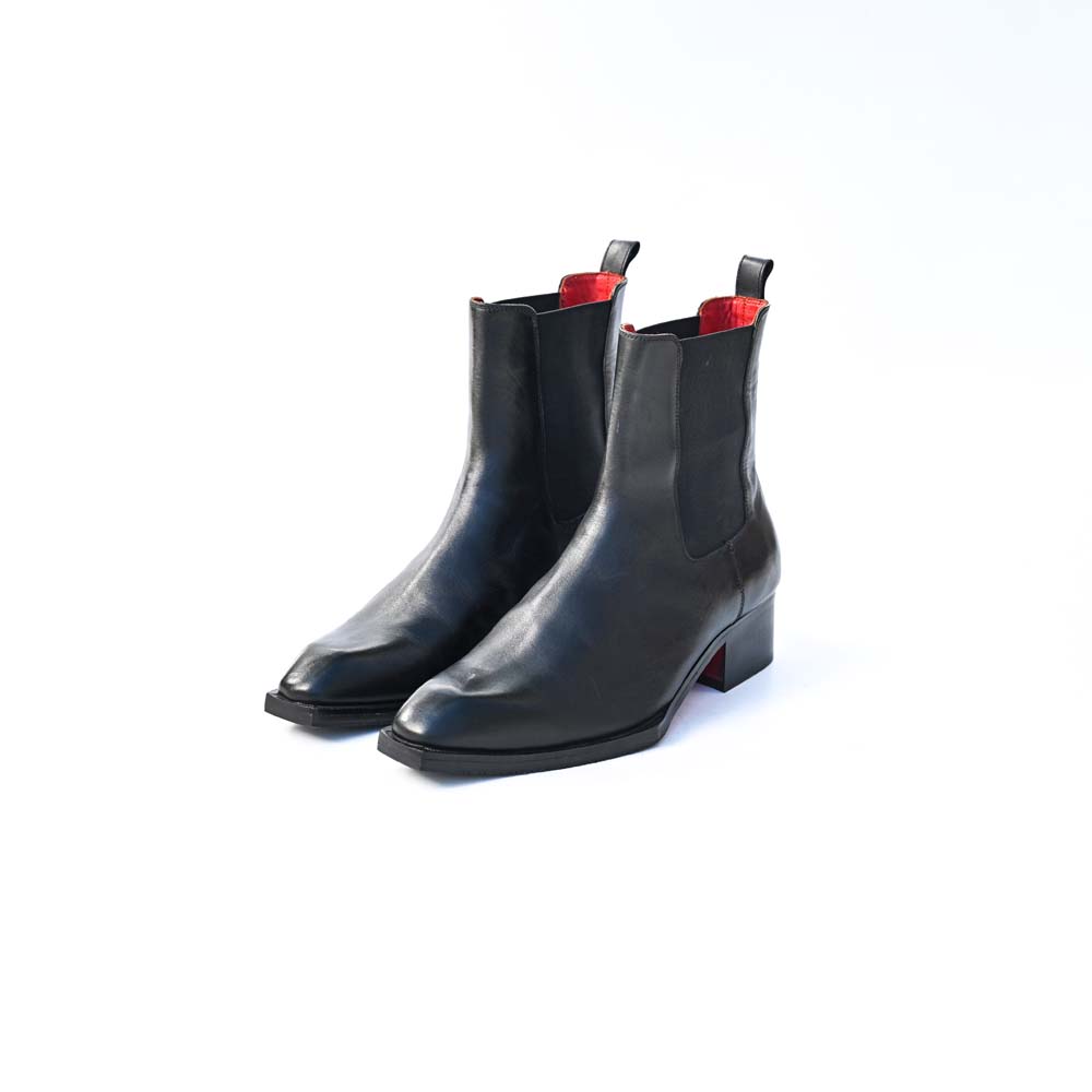 Made from premium black full-grain leather, the clean Chelsea silhouette is elevated by a distinct Cuban heel, adding a subtle yet powerful edge to every step. The contrast red leather lining inside reflects Cheques’ attention to detail : seen, felt, and appreciated by the wearer.
