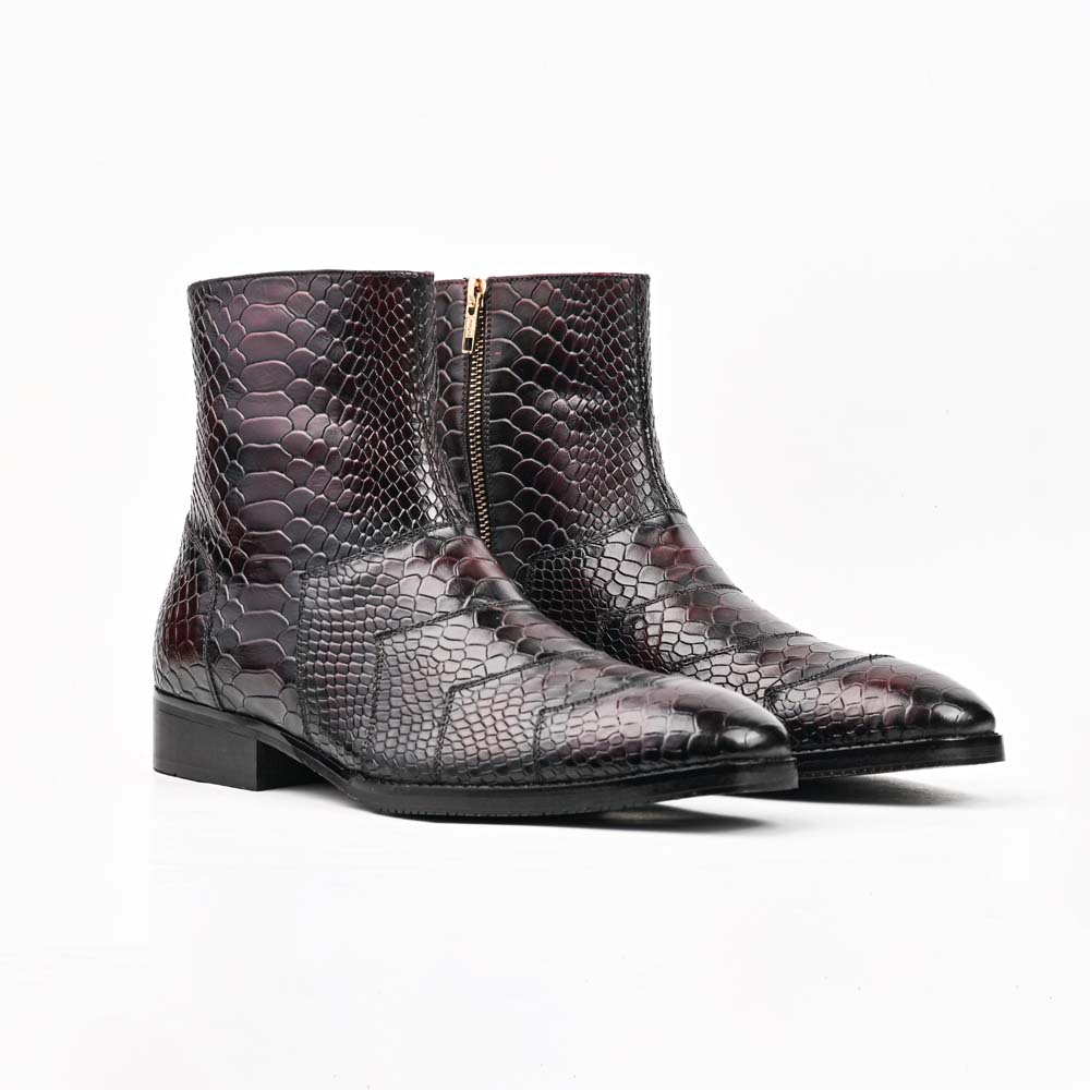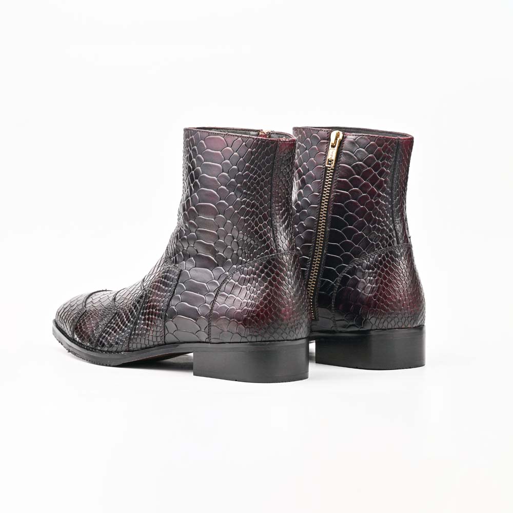 The deep black-cherry patina and the intricate scale patterns suggest a high level of craftsmanship, likely utilizing exotic python or a premium embossed calfskin. Dipped in a deep, multi-tonal burgundy that borders on obsidian, these boots are designed for the man who views style as a form of personal architecture.