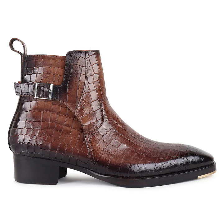 Elevate your footwear collection with our Brown Croco Strapped Boots. Featuring luxurious croco-textured leather, these boots are accented with bold leather straps for a distinctive, rugged look. The rich brown hue and premium craftsmanship create a perfect balance of sophistication and edge, making them ideal for those who seek both style and durability in their footwear. With a secure fit and timeless design, these boots make a statement with every step.