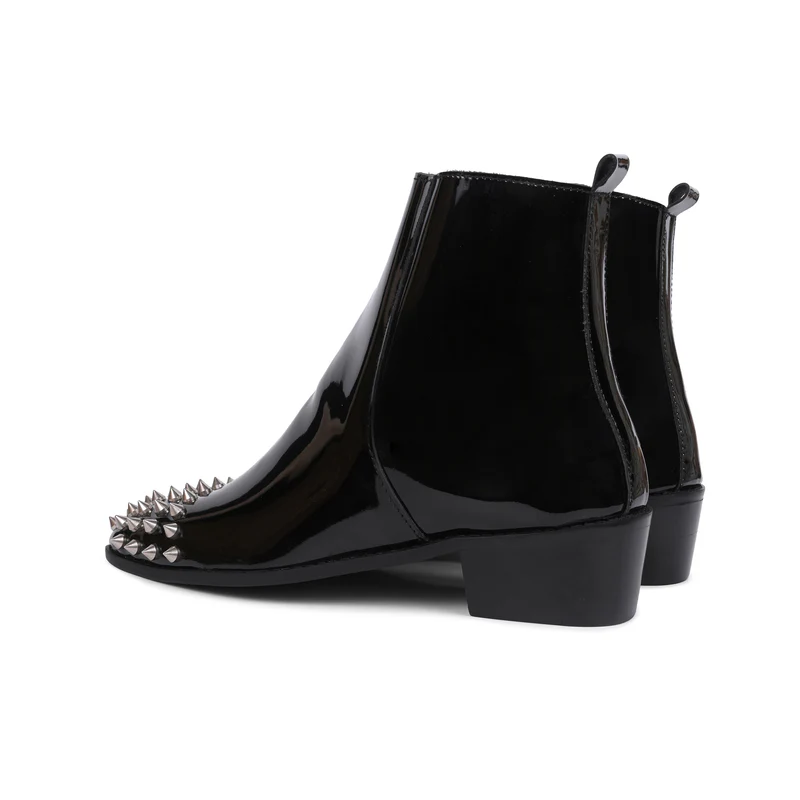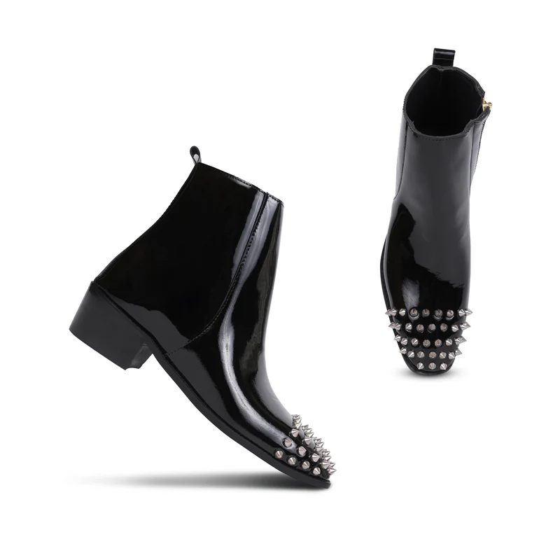 Step into bold luxury with our Patent Leather Cuban Boots with Silver Studs. Featuring a high-shine patent leather finish, these boots are elevated with striking silver studs for an edgy, fashion-forward look. The Cuban heel adds a timeless touch of sophistication, making them perfect for those who want to blend modern style with classic elegance. Crafted for both comfort and impact, these boots are designed to make a statement with every step.