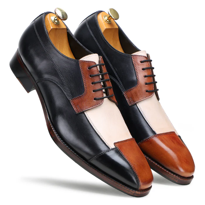 A masterclass in craftsmanship and style, the Cheques Triple Tone Designer Leather Derby is handcrafted from premium triple-tone leather, blending rich shades for a dynamic and sophisticated look. Each pair is cut, stitched, and finished by expert artisans, ensuring a flawless balance of texture, color, and structure. Built using Arron Goodyear construction and lined with French sheepskin leather, these Derbies are made to order exclusively for you, offering unmatched comfort, durability, and the distinctive luxury that defines Cheques.