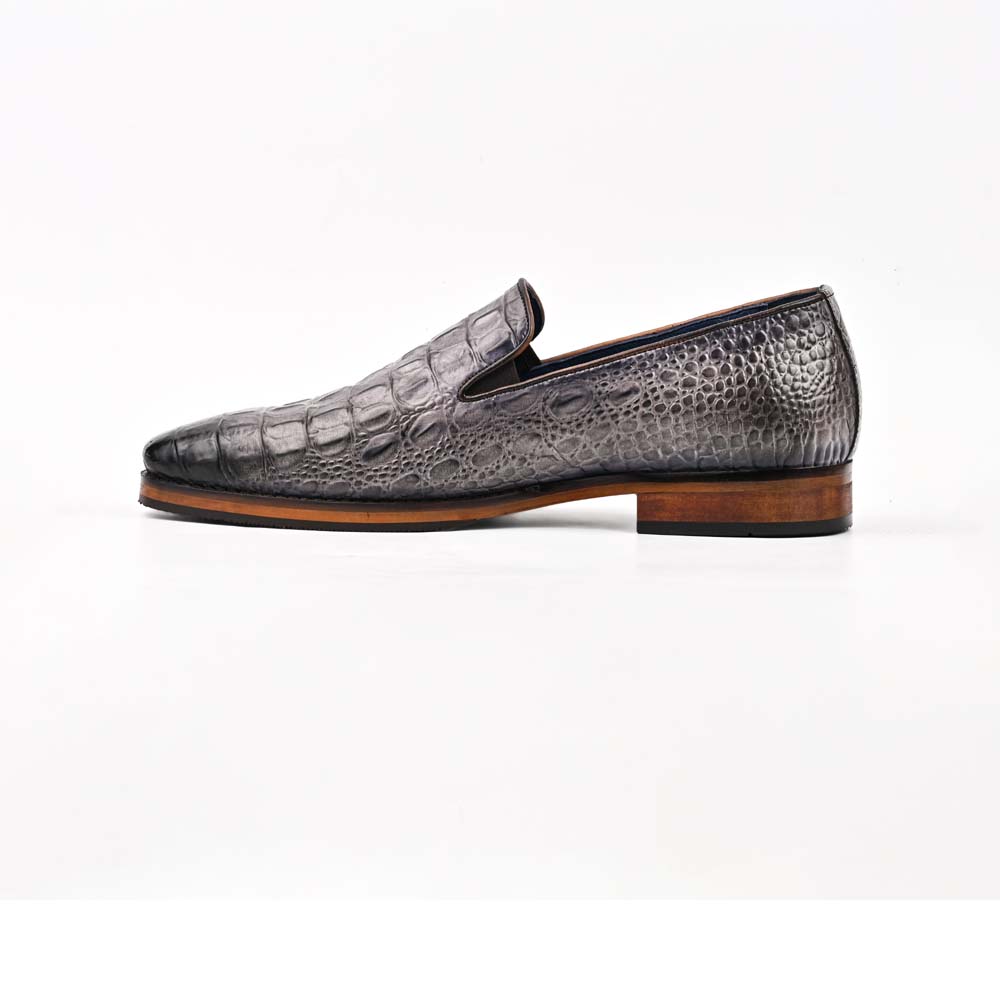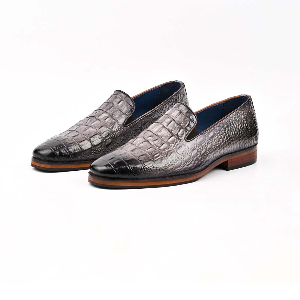 Master the art of effortless elegance with this handcrafted Belgian loafer, featuring a striking silver-to-onyx gradient patina on premium crocodile-embossed leather. The sleek, laceless silhouette is anchored by a stacked leather sole with a contrasting welt, offering a sophisticated architectural edge to contemporary tailoring.
