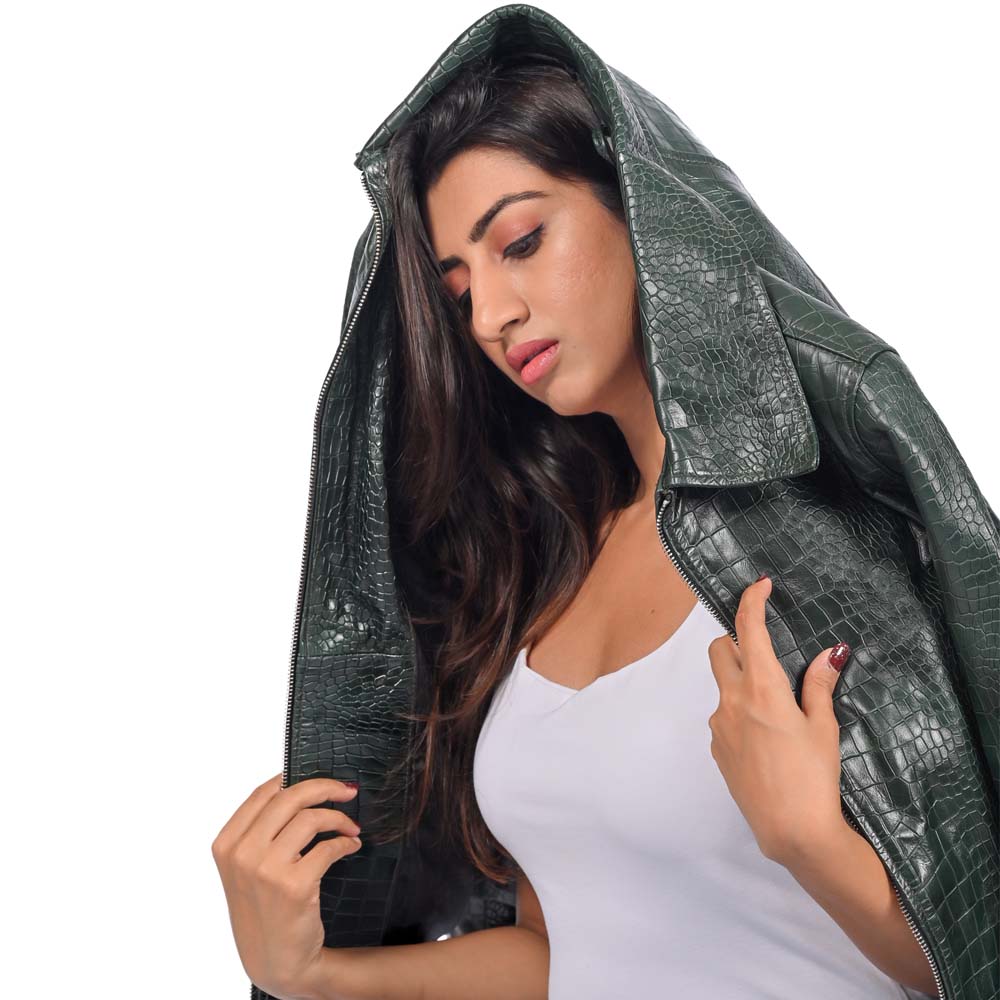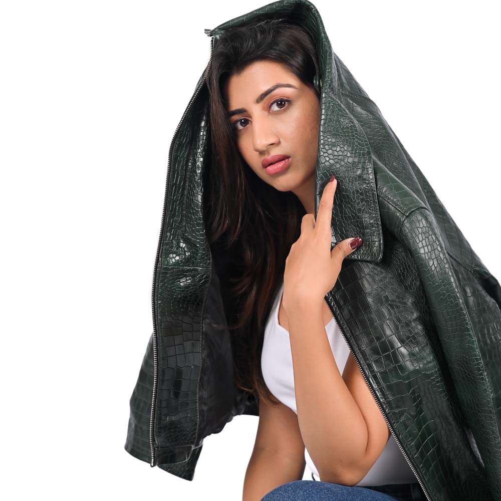 Make a fierce sartorial statement with this high-octane biker jacket, featuring an all-over deep emerald green python-embossed leather for a high-gloss, exotic finish. The architectural silhouette is defined by sharp notched lapels and a sleek industrial silver-tone zipper that adds a modern, rebellious edge to the luxurious texture.